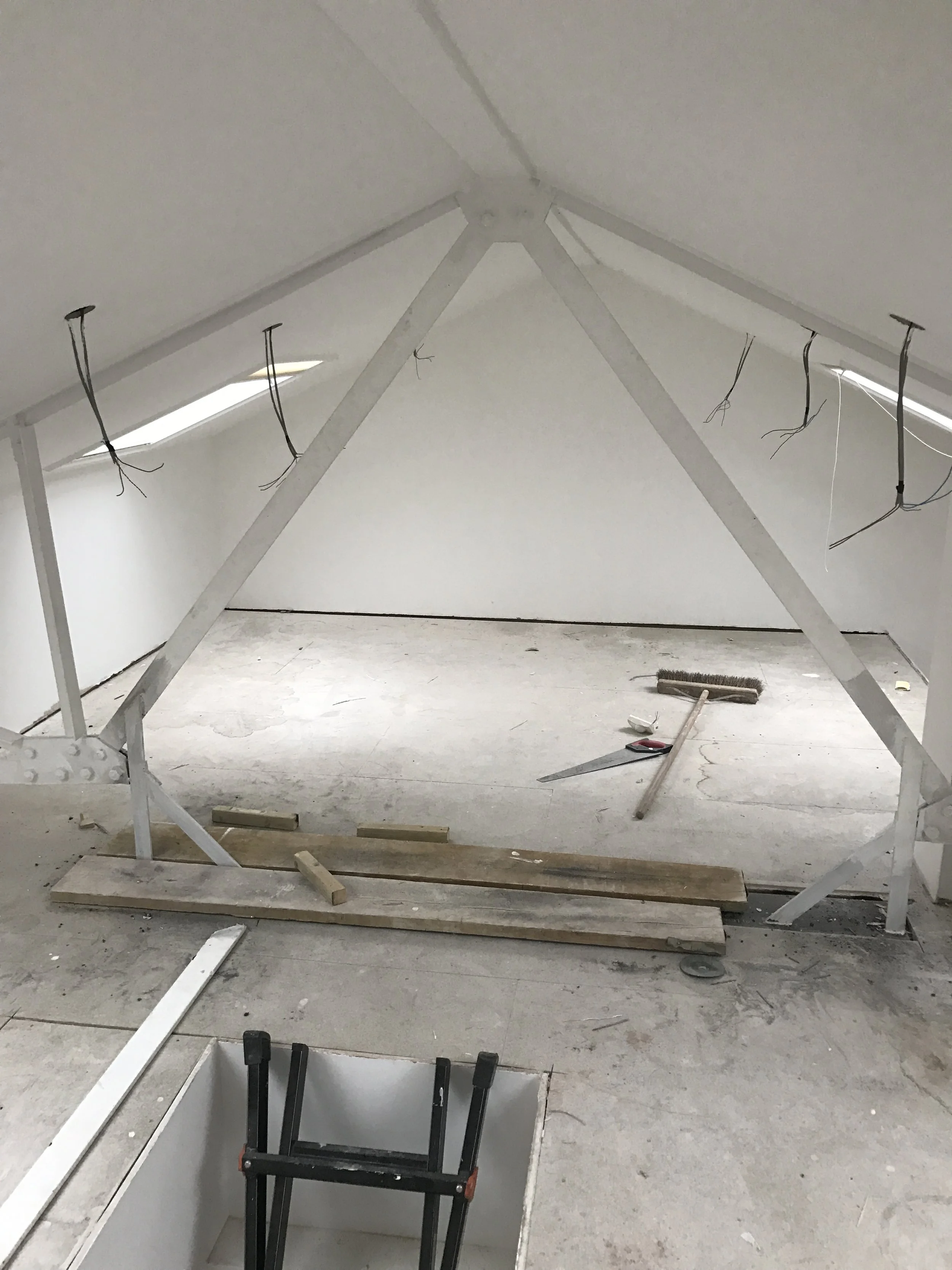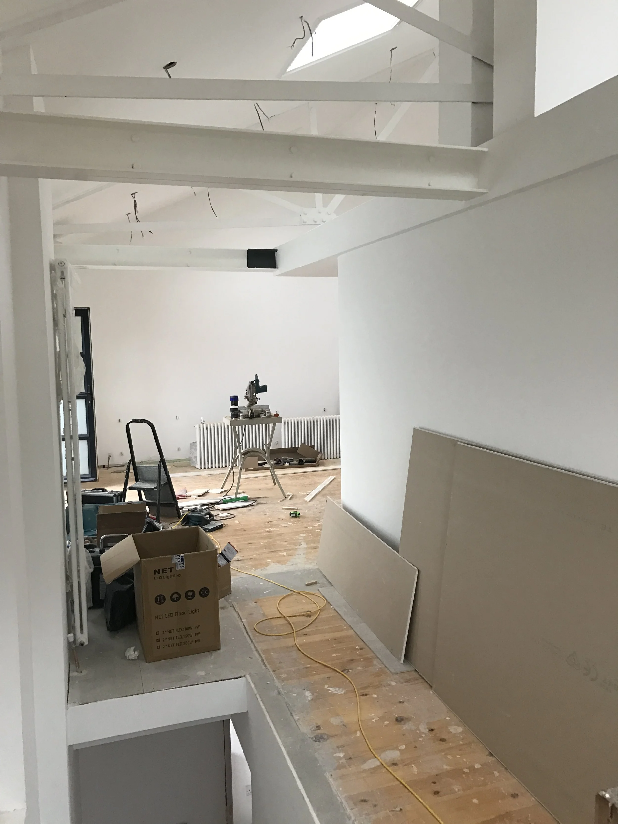 Interior of a room under construction with tools, boxes, and materials scattered around, unfinished walls and ceiling, and light coming from skylights.