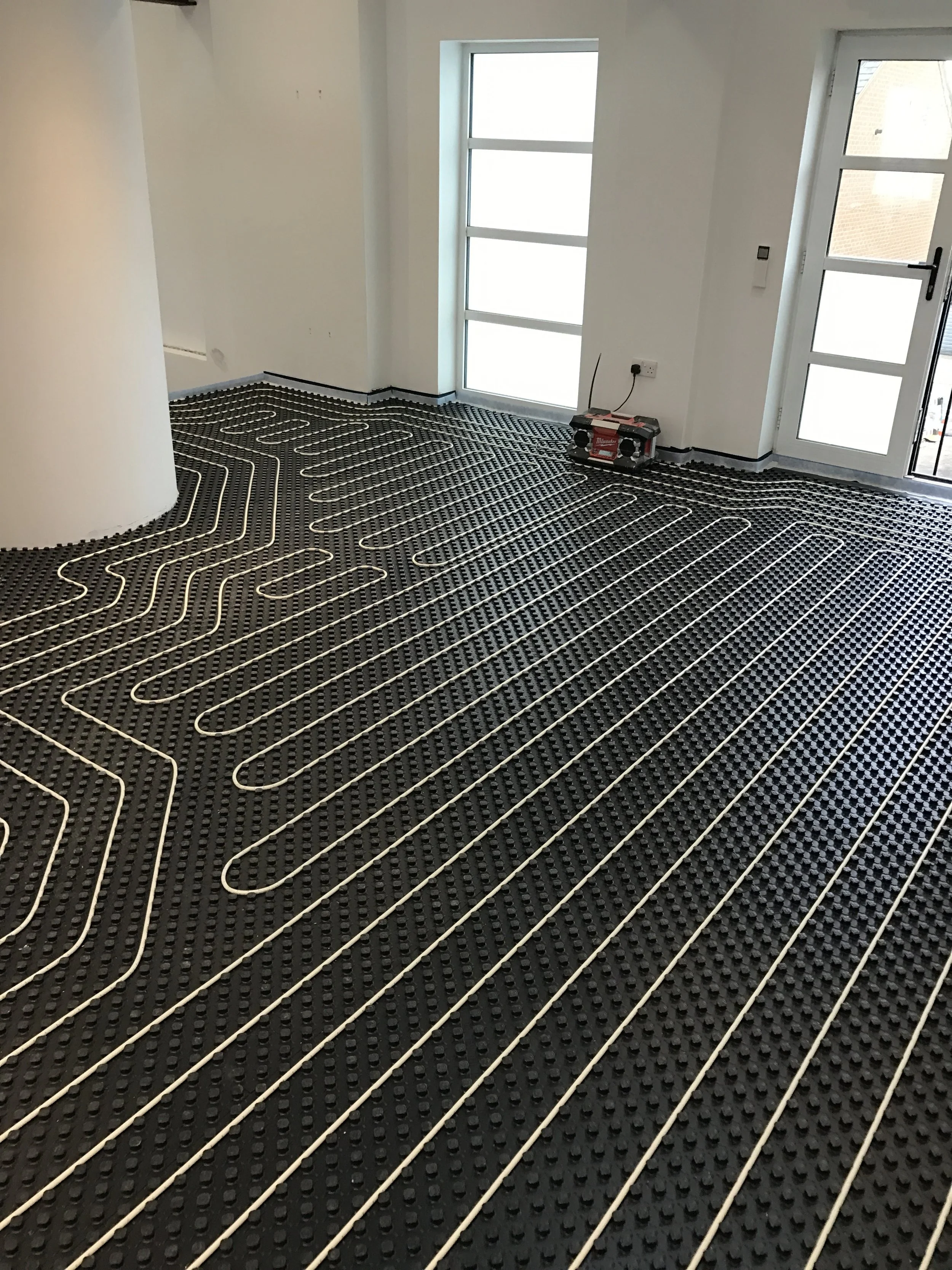 Interior of a room with underfloor heating pipes installed on a black, textured surface, with two windows and a door in the background.