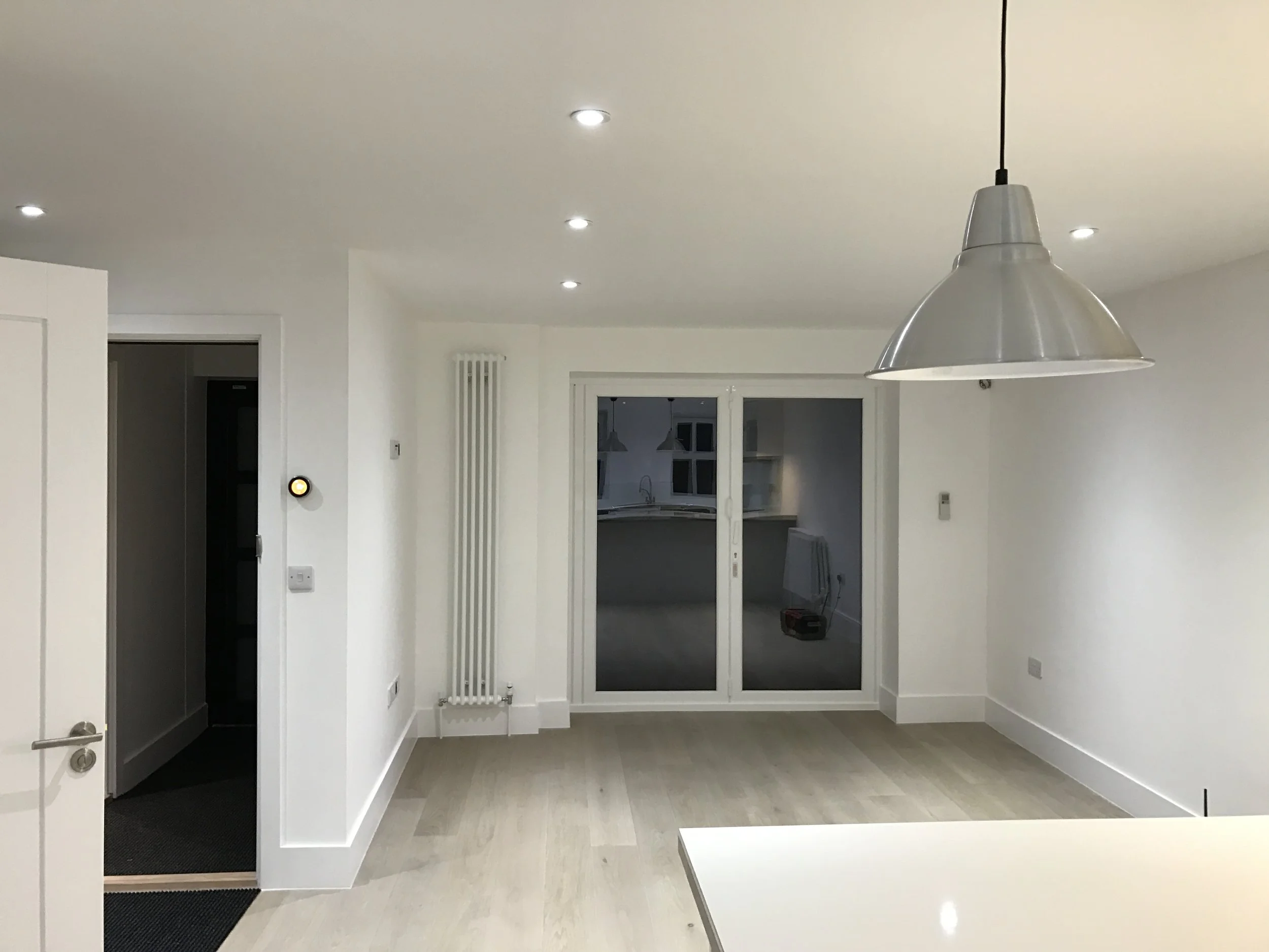 Interior of a room under construction with a polished concrete floor, white walls, and wiring hanging from the ceiling.
